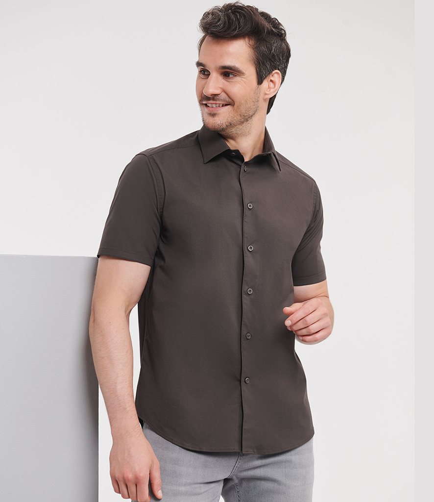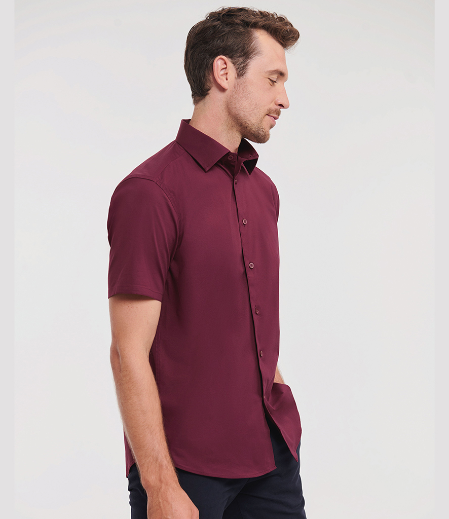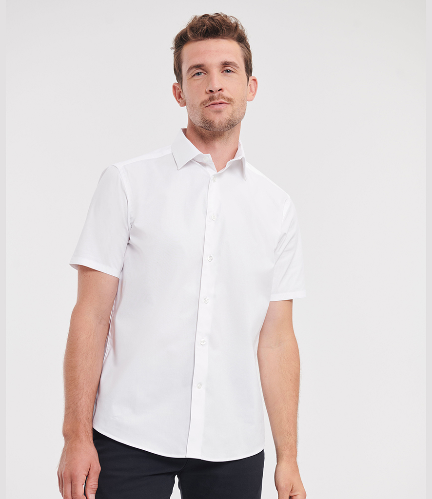 Fitted cut and contemporary design make this style the right choice wherever a modern appearance is required. Smooth fabric with a slight stretch for added comfort and fit. Smart, semi cut-away collar with single button. Rounded hem.