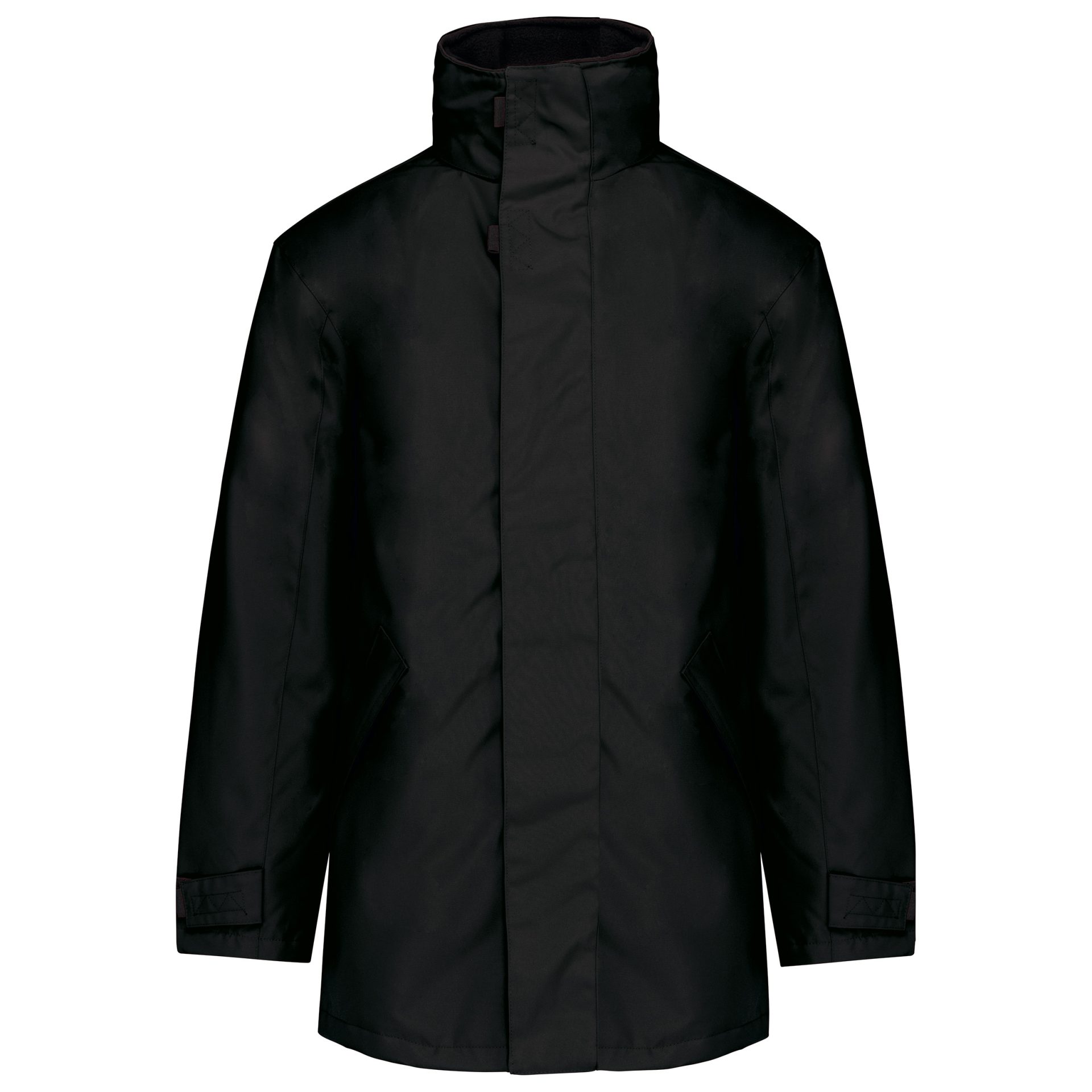 Inside wadding with polyester. 2 outside zipped pockets, 1 inside pocket, 1 internal mobile phone pocket. Collar contained hood, lined collar. Inside zipper for easier personalisation.