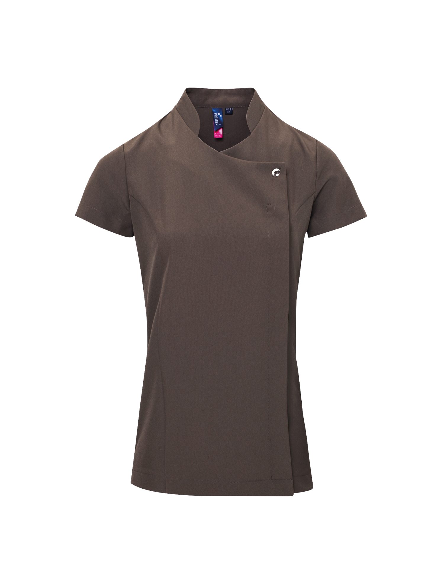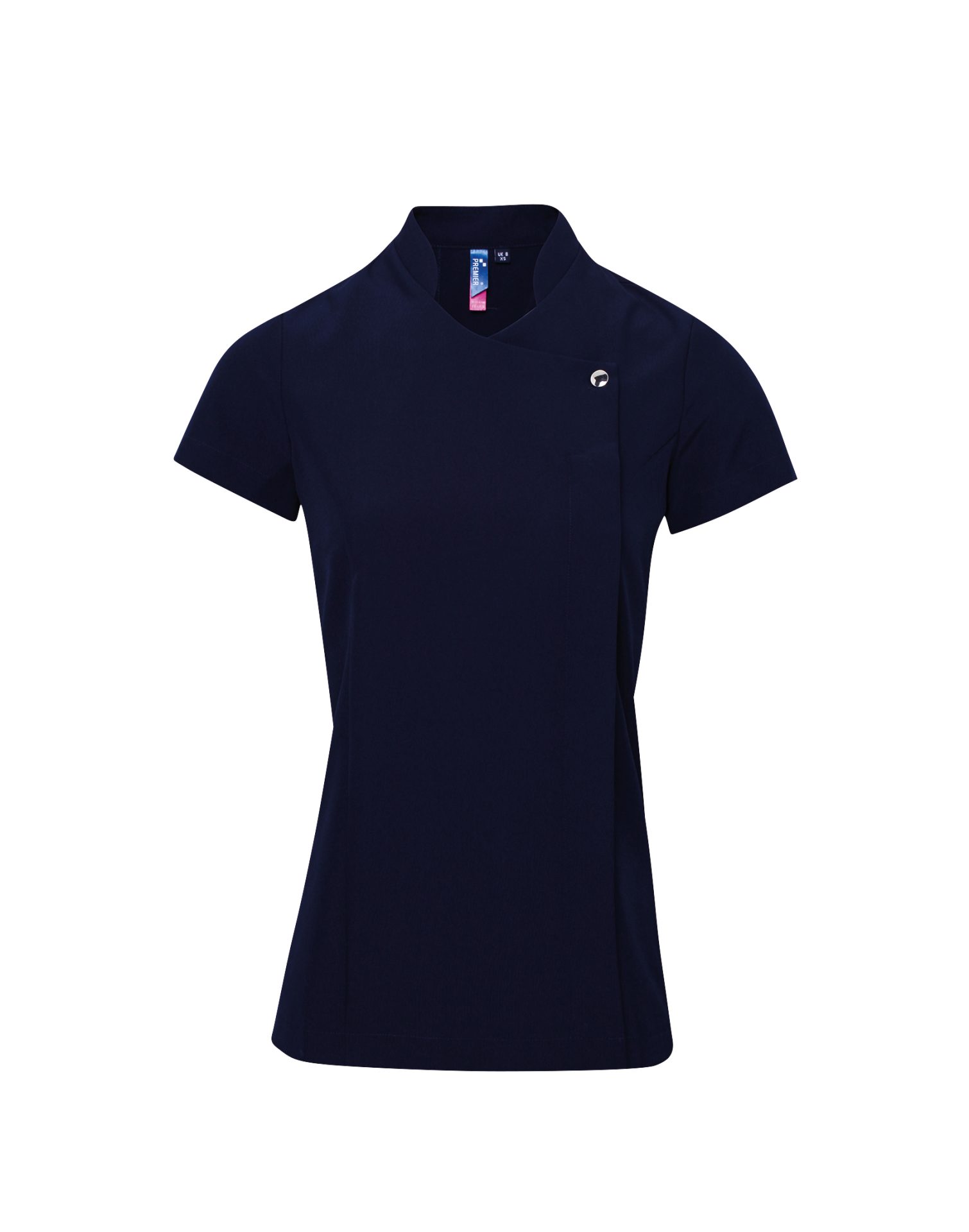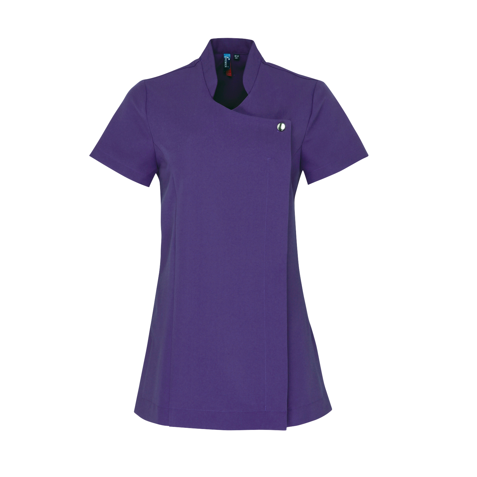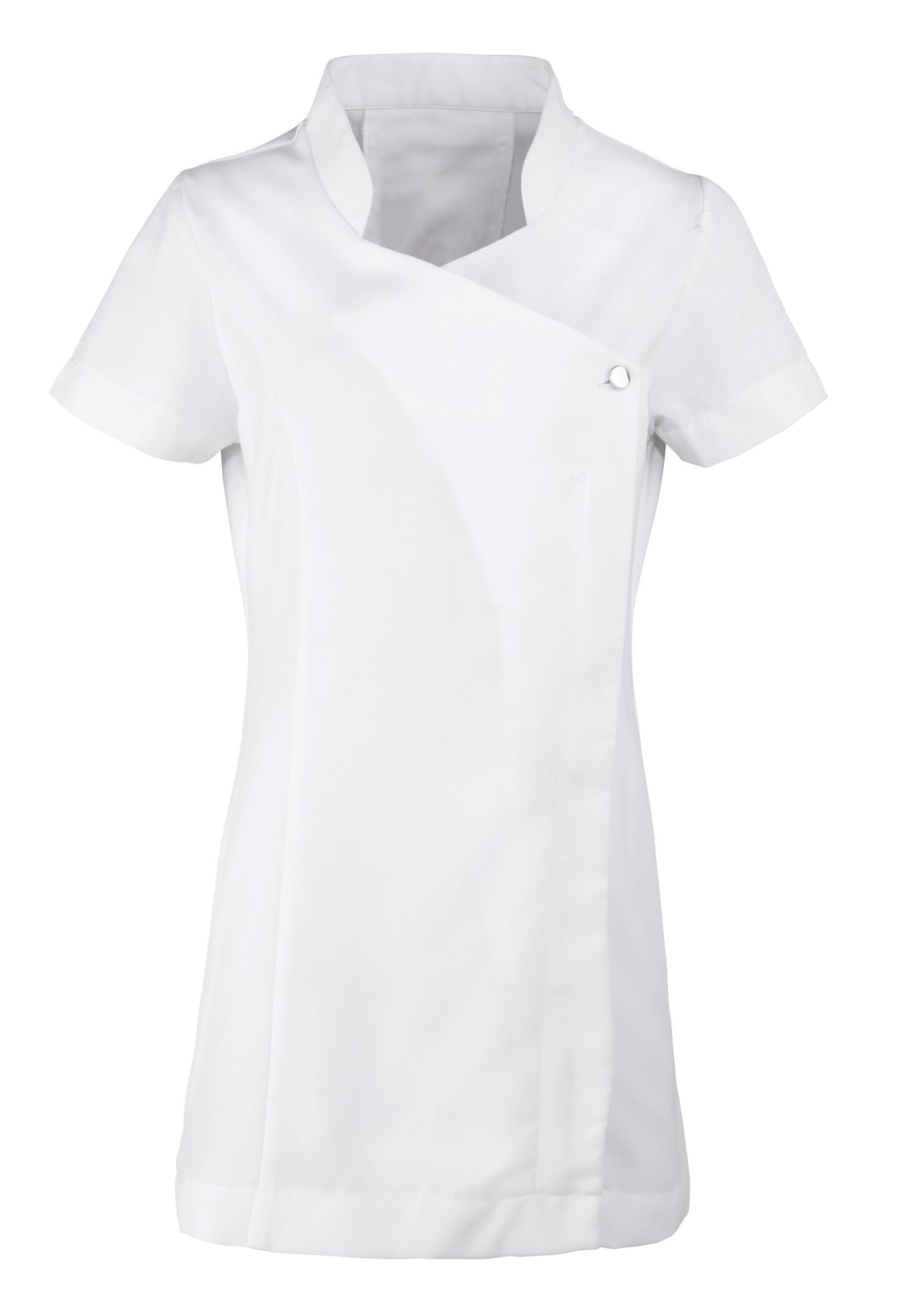 Beauty and spa tunic with feature button front fastening with concealed zip. Mandarin collar. Short sleeve. Princess seams. Side vents. Back pleat for ease of movement. Easycare.